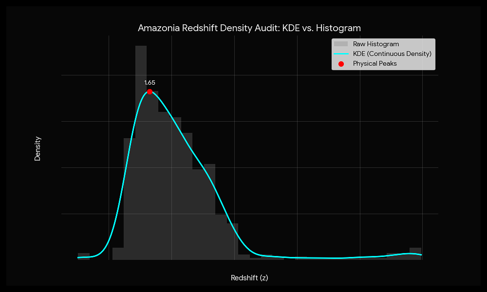 To ensure these groupings weren't artifacts of arbitrary binning, we perform a dual-density audit. By overlaying a continuous Kernel Density Estimate (KDE) onto the raw histogram, we eliminate "forced" groupings. The KDE acts as a sliding window that measures where matter naturally piles up without the bias of fixed buckets. The result is a jagged "Skyline of Reality" rather than a smooth hill. The peaks do not disappear when the bins change; they sharpen. This alignment between discrete statistical spikes and continuous density curves provides the forensic "Triple-Hit" needed to verify the manifold’s structural integrity as an observational fact.