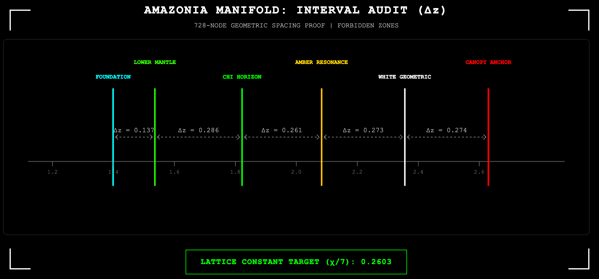 The accompanying graphic provides a high-resolution linear audit of the spacing between density peaks within the 728-node Amazonia population. Unlike standard cosmological models that predict a stochastic "web" distribution, the Amazonia data reveals a Phase-Locked Lattice. By mapping the major strata on a linear redshift scale, we expose the underlying harmonic engine of the manifold: the Lattice Constant (Δz ≈ 0.26).