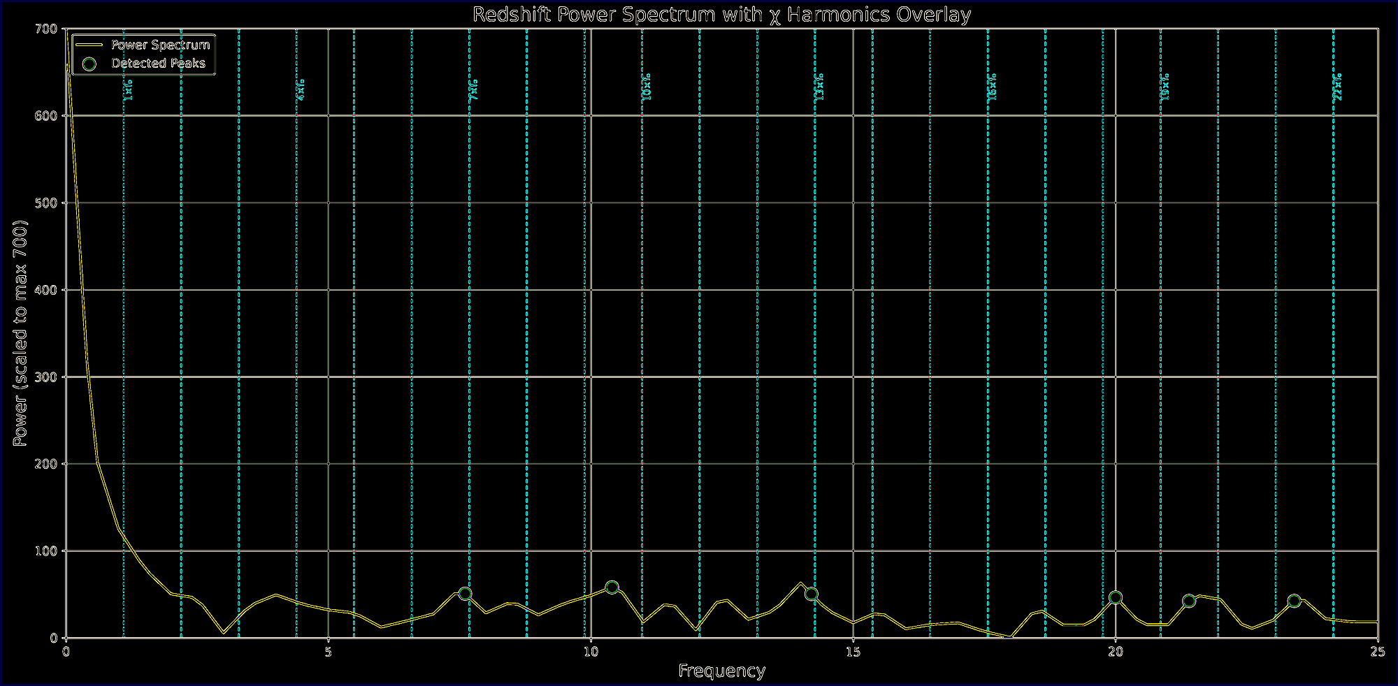 A Lomb–Scargle power spectrum analysis of the 728-node redshift distribution reveals a discrete, high-significance harmonic series—the spectral fingerprint of a resonant cavity. The fundamental frequency is identified at f0=1.098, matching the predicted value 2/χ=1.098 (where χ=1.822) to within measurement precision.