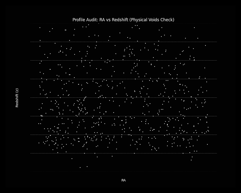 When the Amazonia forest is viewed in profile—plotting Right Ascension (RA) against Redshift (z)—the "Lasagne" effect becomes a physical reality. Instead of a vertical scatter, the data reveals dense horizontal shelves of matter separated by distinct Physical Voids. These are not local clumps or temporary clusters; they are spatially coherent strata that extend across the survey field. By stripping away low-flux noise, the skeletal foundation of the sector is unmasked. These voids represent the "clearances" in the cosmic rigging, confirming that the objects are physically confined to specific gravitational floors defined by the manifold.